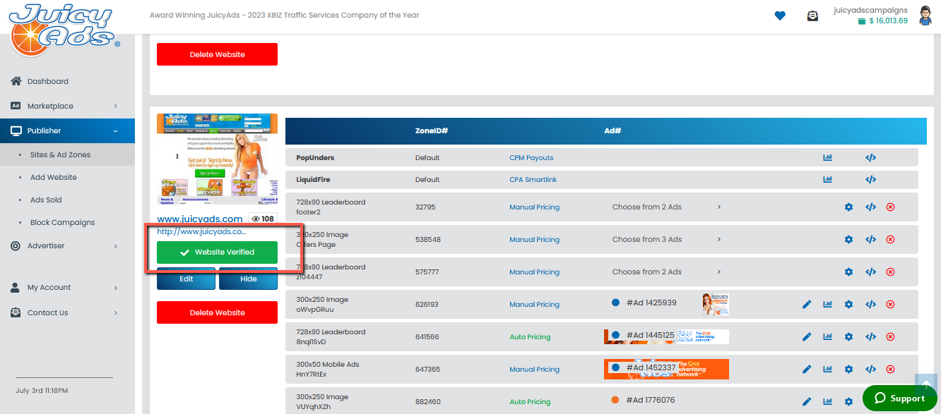 Verification is an essential process to confirm your ownership of the website you have registered with JuicyAds. It is a requirement in order to sell ads within our network. To successfully verify your website, please follow the step-by-step instructions outlined below: