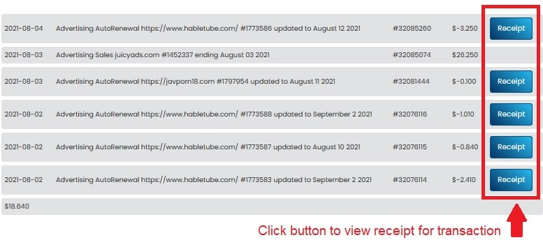 A comprehensive list of all transactions conducted within the selected date range will be presented, accompanied by a "Receipt" button located on the right-hand side. To obtain the invoice for a specific transaction, simply click on the "Receipt" button associated with that transaction. This will allow you to access and download the invoice for your records.